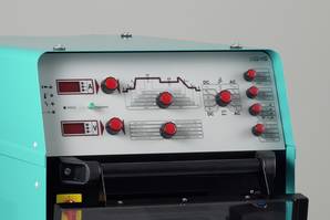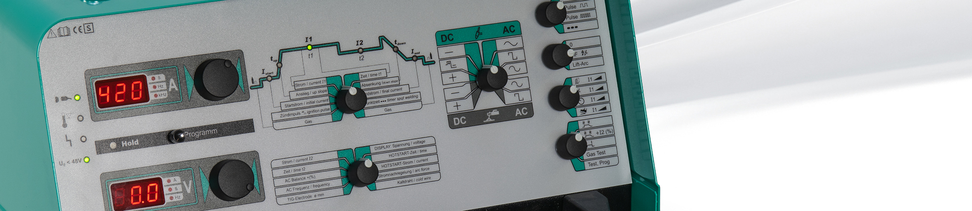 - 2 Drehgeber und 2 Wahlschalter für: Strom 1, Zeit 1, Strom 2, Zeit 2 (für Pulsbetrieb), Gasvor-/Gasnachströmzeit, Stromanstiegs-/Stromabsenkzeit, Startstrom, Endstrom, Punktzeit, AC Balance, AC Frequenz, Stromnachregelung, Hotstart-Zeit und -Strom
