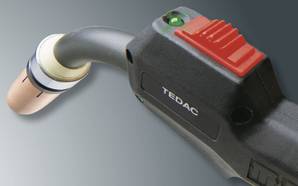 Das Merkle-TEDAC System bietet stufenlose Energiefernregelung und Anzeige direkt am Schweißbrenner. Mit einem Schiebetaster auf der Oberseite des TEDAC-Brennerhandgriffs kann die Energiezufuhr beim Schweißen erhöht und abgesenkt werden. An einer gut sichtbaren, mehrfarbigen LED-Anzeige wird die gerade eingestellte Energie direkt am TEDAC-Brenner dargestellt.